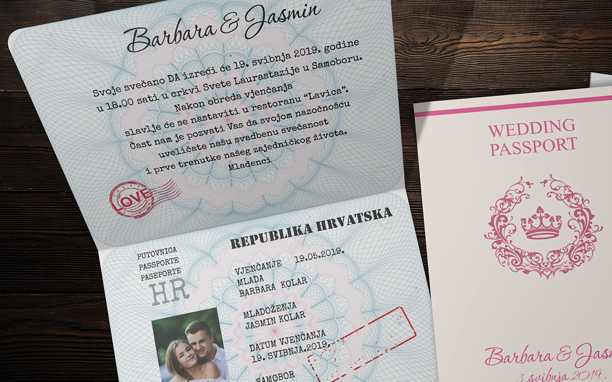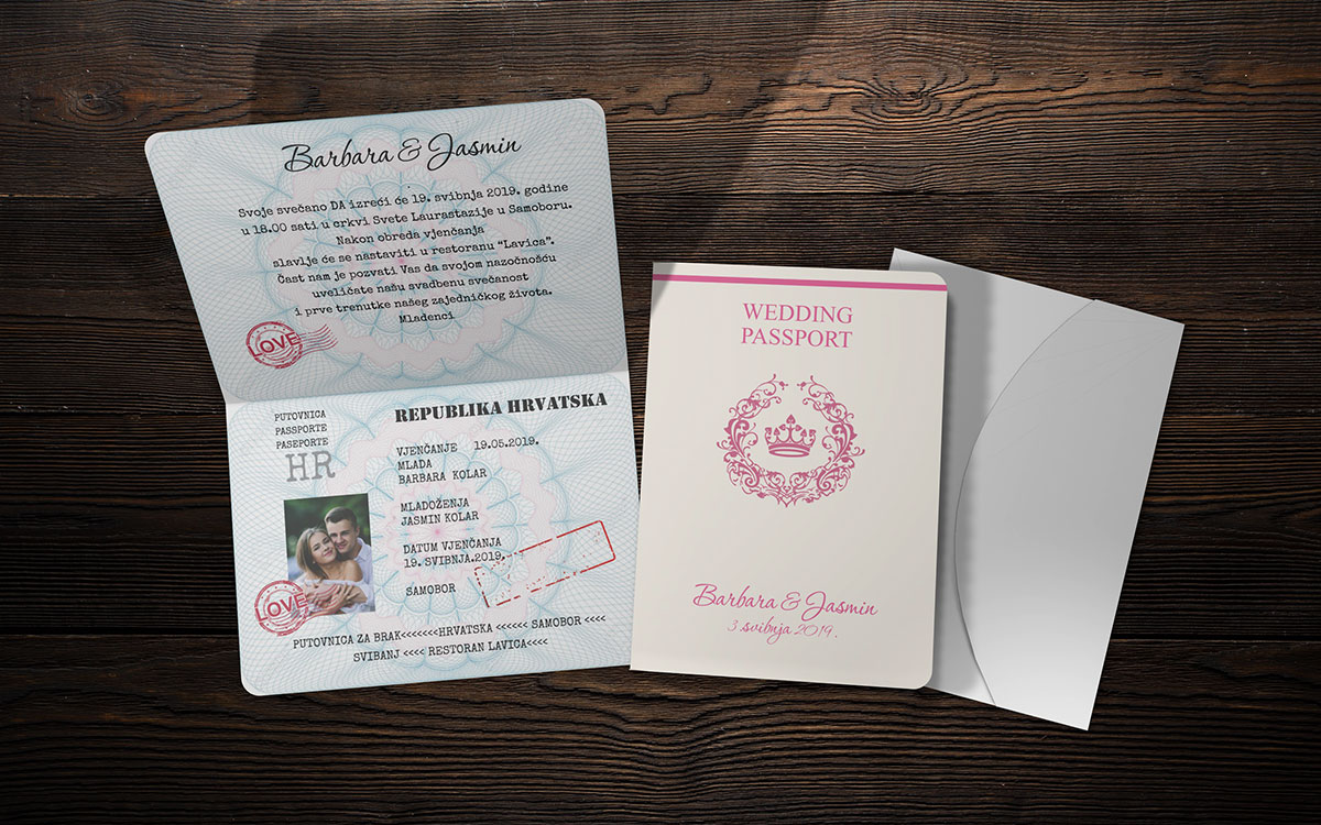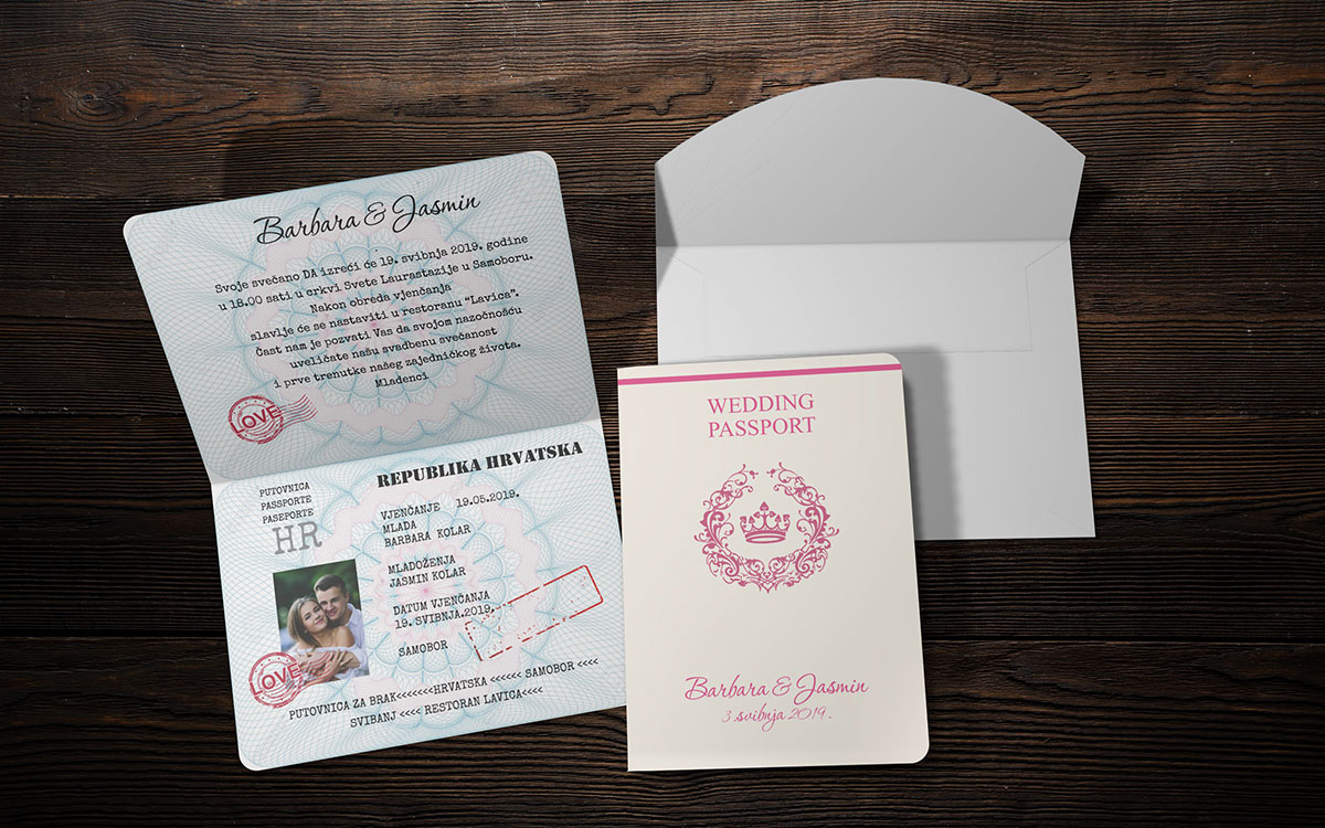 Stilizirana pozivnica u obliku putovnice veličine 12,5×17,5 cm .