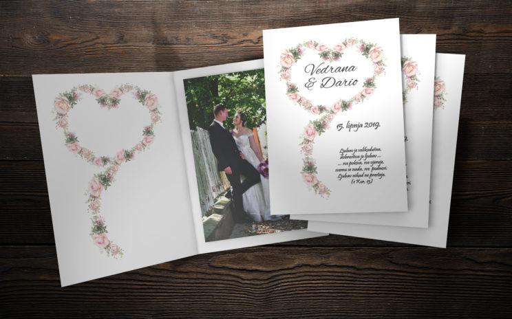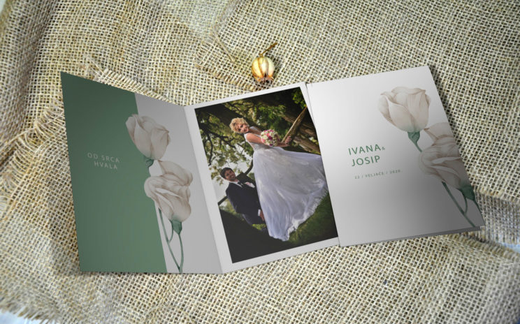 0,80 Eura Zahvalnica je izrađena od bijelog 300/g mat papira ili papira sa pearl efektom. Veličina zahvalnice je 12×16 za fotografiju 10×15 ili 14×19 za fotografiju 13×18 cm.Moguća je promjena boje dizajna, fonta i vrste papira.Uz zahvalnicu je moguće naručiti kovertu 13×18 cm od 170/g papira po cijeni od 1,75 kn. Minimalna količina je 30 komada